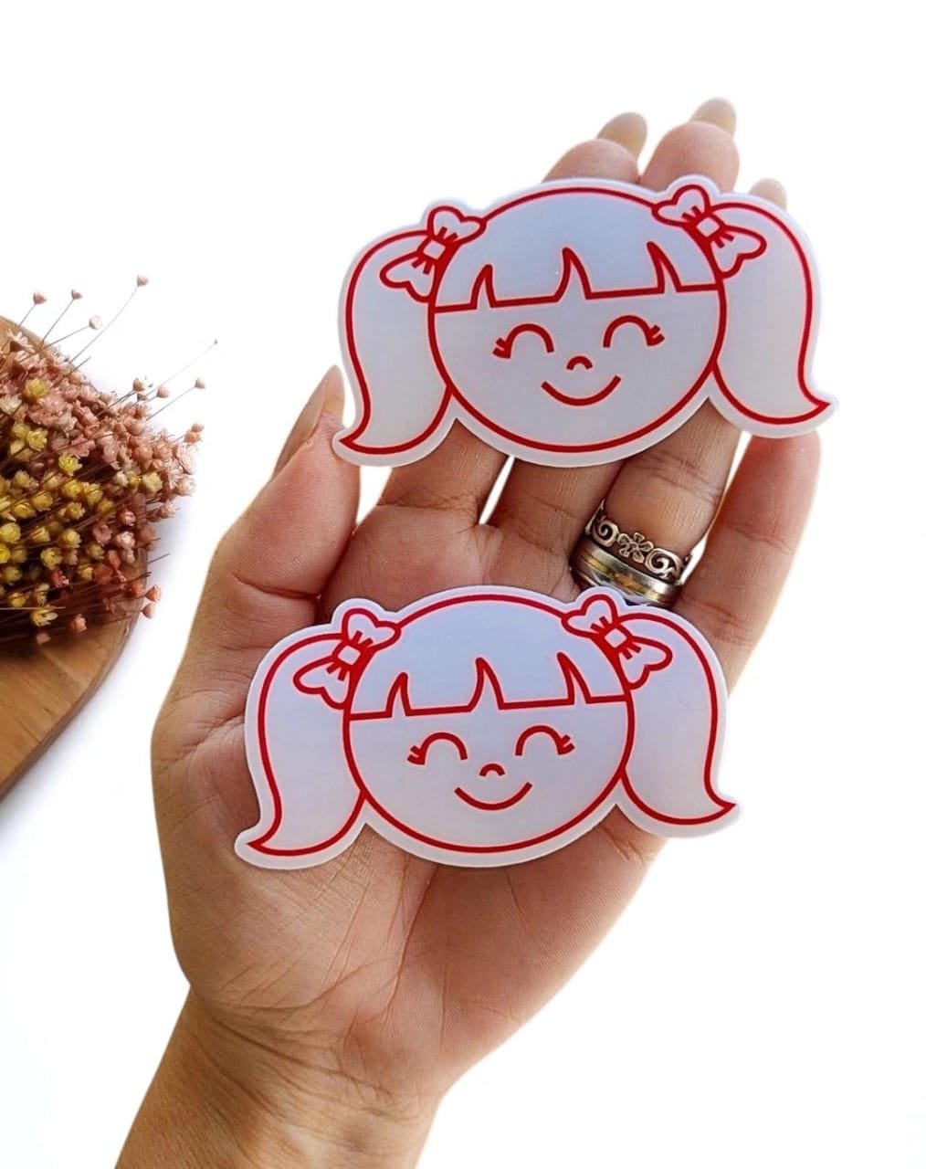 APLIQUE EM ACRÍLICO SUBLIMADO CURVADO MENININHA RABISCADA VERMELHA 8 CM UND
