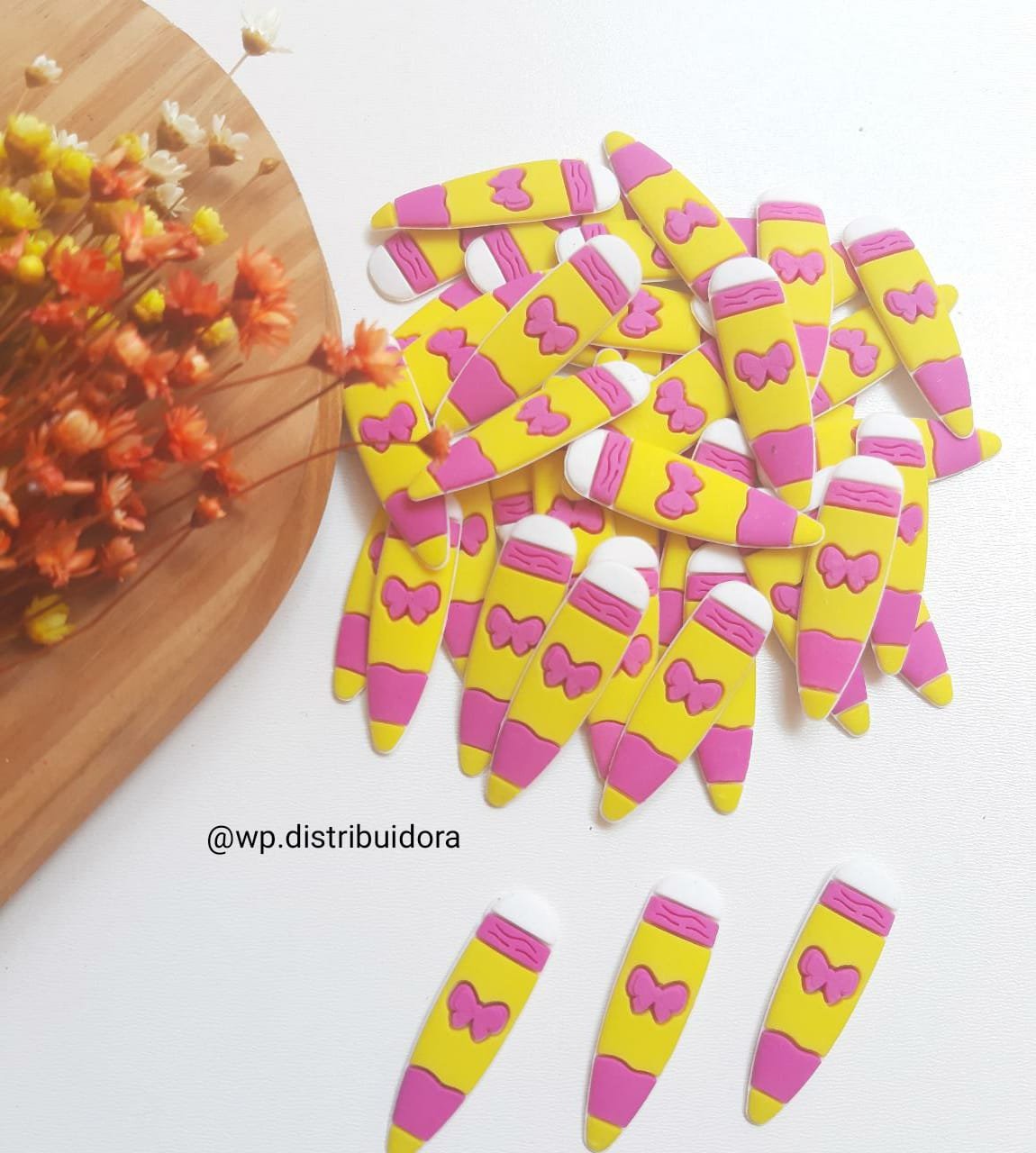 APLIQUE EMBORRACHADO LÁPIS AMARELO DETALHES ROSA 4,2CM C/ 2 UND