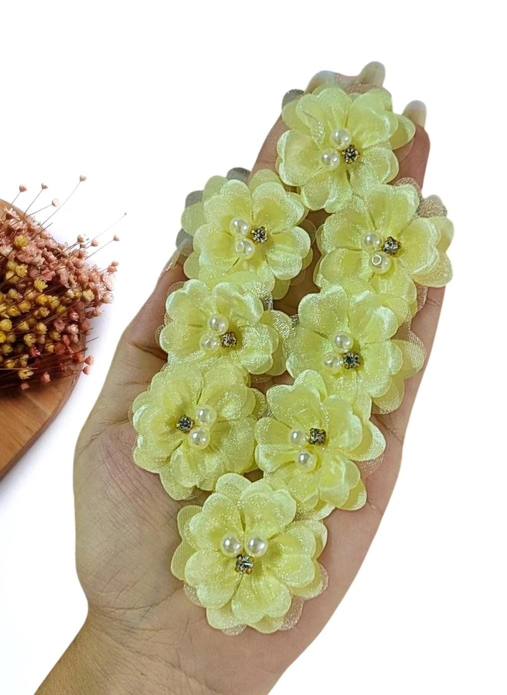 APLIQUE FLOR IMPORTADA DE CETIM COM VOAL AMARELA 3,5CM UND